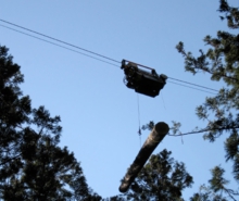 船明ダムに集合してそこから20分ほど山の中に入り現地到着。今回の山は、谷をはさんで急傾斜地でしたので、伐採体験はできませんでしたが、架線を張って、ケーブルで出材する様子を見学することが出来ました。