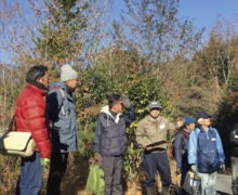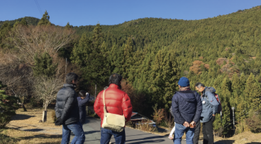 この日は晴天で風もなく散策日和でした。お天道様 の恵みがとてもありがたく感じられます。山の麓にあ る自宅前から、舩窪さんの手入れする山の樹々を眺め てみる。ずっと右手奥まで続いているのだそうです。