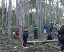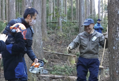 今年伐採を行っている作業場の 中。樹々を間近に感じながら伐 採方法や市場価値を高めるノウ ハウなどお聞きしました。