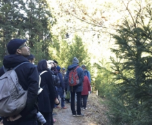 作業道を散策。清々しい! 途中立ち止まって、鳥・樹・動 物・神様にまつわる不思議な話 しを拝聴。