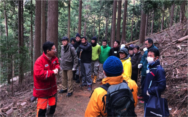 浜松市天竜区熊で12代続く林業家、熊平さんの山を見学させていただきました。樹齢80年の桧と樹齢60年の杉の山を散策しながら、熊平さんに200年続く林業家の歴史と、現在の林業家の実状、これからのあり方等のお話を伺いました。熊平さんの目指す「気持ちいい山を作りたい」や、 国の施策と現場とのギャップ、熊平さんの行政への働きかけなど熱い思いが伝わる内容でした。伐採見学では樹齢70年の杉が倒れる瞬間の迫力に参加者から「おっ〜!」との声もあがりました。