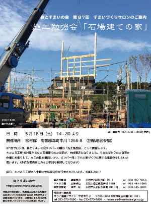 会場は、完成間近の木ごころ工房 松村寛生さんの「石場建て」のご自宅。礎石の上に柱をのせる伝統的な建て方は、最近ではほとんど目にすることはできません。建物の各所に、伝統技術を受け継ぐ大工の松村さんらしいチョイスが数多くみられ「おおっー、こうきたか!!」と、一同おおいに盛り上がりました。