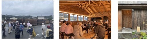 原木加工・各部位加工の機械と木材保管場所を案内いただいたあと木をふんだんに使った集会場へ。森町森林組合 甚沢さん 林業家 船窪さん もと県職員 早津さん で永田社⾧・永田会⾧を囲み、セミナーと座談会を行いまた。最初に68 年前の天竜林業の映像を視聴。多くの人々が林業に従事する当時のはつらつとした様子は、私たちが知る現在の林業との間に隔たりがあるように感じられました。そうした空気感のなか、永田さんから他地域材と天竜材の違い、天然乾燥にこだわる理由、木の部位ごとの性質などのお話を伺いました。船窪さんからは、葉がらし材の良さや年々深刻化する害虫被害のお話、甚沢さんからは樹齢について、早津さんには行政に対する率直な意見が多数あがりました。
