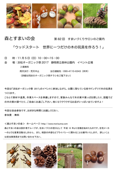 今回は「浜松オーガニック祭2017」に参加しながら、公園に落ちている色々などんぐりや松ぼっくり、枝などを使って玩具を作ろう!というイベントでした。こちらで事前に用意した素材に加え、接着剤、マジックや簡単な工具は用意しておき、参加者にはその場でオリジナルのコマ、やじろべえ、ネックレス、オーナメント等を作成してもらうスタイルです。(参加費は無料)