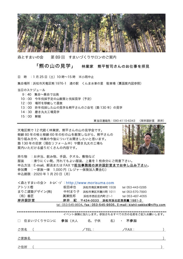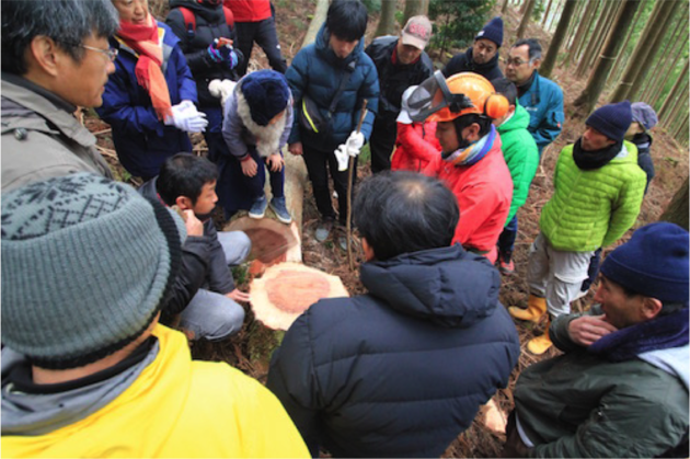 浜松市天竜区熊で12代続く林業家、熊平さんの山を見学させていただきました。樹齢80年の桧と樹齢60年の杉の山を散策しながら、熊平さんに200年続く林業家の歴史と、現在の林業家の実状、これからのあり方等のお話を伺いました。熊平さんの目指す「気持ちいい山を作りたい」や、 国の施策と現場とのギャップ、熊平さんの行政への働きかけなど熱い思いが伝わる内容でした。伐採見学では樹齢70年の杉が倒れる瞬間の迫力に参加者から「おっ〜!」との声もあがりました。