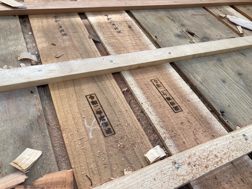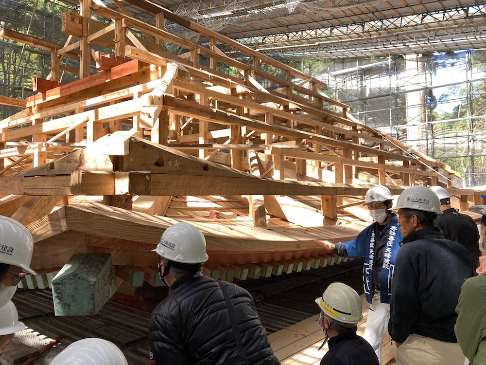 次に天峰建設の平松さん、武田棟梁より神門の解体から現在までの工事の写真と現地で解説していただきました。伝統文化財の修復は100年に1回屋根の葺き替え、300年に1回全解体&修復を行う。建設当時の墨(高さ等の基準。現代まで残っている!)を頼りにできるだけ古材を残すように修復し、修復した材には焼印にて修復年を残すとのこと。また前回の修復で使われた屋根の板金は全て撤去し、改修工事のため伐採した参道の杉の木を利用してこけら葺きにするとの話でした。神門は屋根工事の後、彫刻等の修復を行って2022年の年末に完成するそうです。