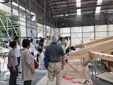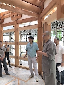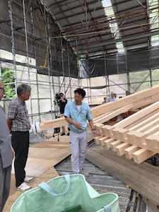 尊永寺の大谷住職、広報の内山田さん、施工担当の(株)飛鳥工務店の鈴木佑棟梁、設計担当の池田一級建築士事務所の池田さんから様々なお話を聞きながら、その歴史と手仕事を間近で見ることができました。
