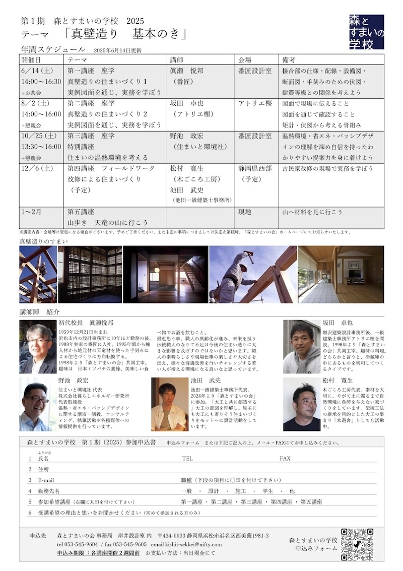 森とすまいの学校は、木のこと、木造住宅に興味の有る方ならどなたでもご参加いただけます。次回開催講座の詳しい内容については、>>> インフォメーションでご確認ください。